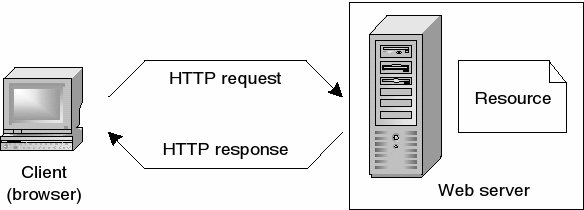 The client browser sends a request for a page to the Web server using the URL of the page. The server processes the request and sends back the requested HTML document.